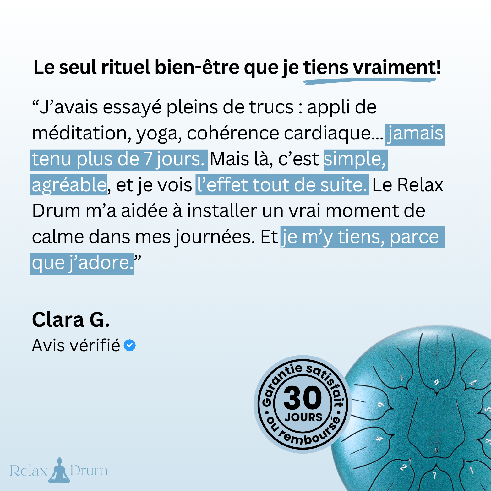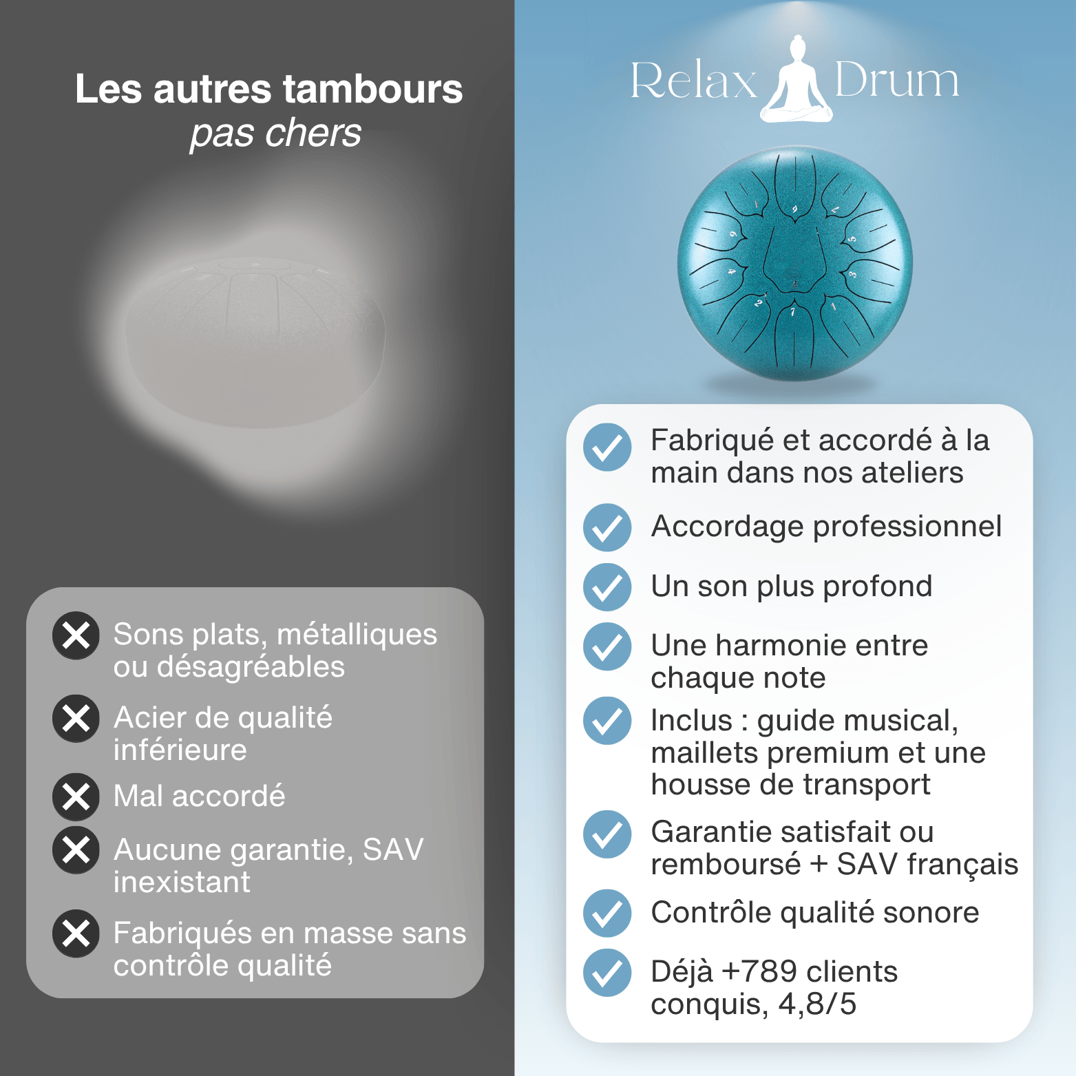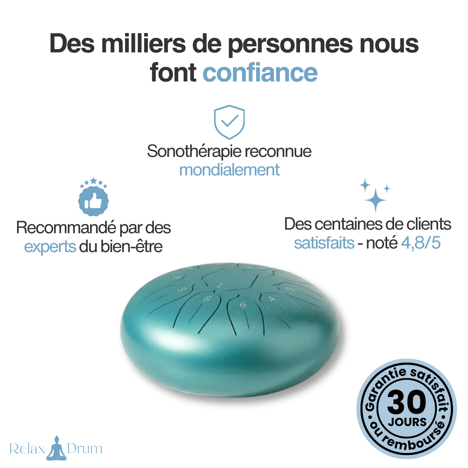 ✔ Clients satisfaits : Relax Drum est fier de servir plus de 500 clients, nous commençons à vendre dans le monde entier suite à notre succès. Nos avis positifs confirment l’efficacité du Relax Drum pour la relaxation et le bien-être.